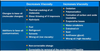 1. Jika terdapat Perubahan Rantai Molekul Kimia Oli maka Pengurangan Viskositas disebabkan oleh panas operasi, gesekan fluida dan hidrolisis sedangkan Penambahan Viskositas disebabkan oleh oksidasi, polimerisasi, pembentukan carbon dan oksida yang tidak terlarut serta penguapan oli