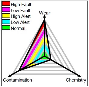 Peralatan tersebut yang menjadi peralatan utama Oil Analysis yang lengkap dan data disajikan dalam Trivektor (Wear —> gram metal pengotor / partikel keausan seperti ferrous dan logam mineral, Contamination —> partikel ISO Code, Free Water dan Chemistry —> TAN, Oxidation, Viscosity) beserta gambar visualisasi dari kontaminan. Untuk lebih jelasnya Trivektor dan kandungannya bisa dilihat di gambar & tabel dibawah ini