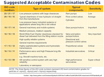 Menurut standar ISO Codes diatas terdapat bermacam – macam standar yang dipakai untuk Oil Analysis tergantung dari pelumasan untuk apa oli itu. Standar umum yang dipakai di pembangkitan (PLTU) adalah memakai 20/18/15 mengacu ke kedua tabel diatas.