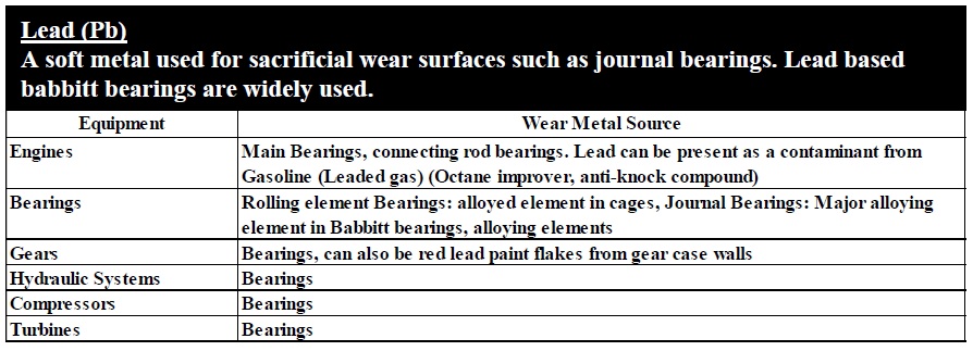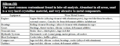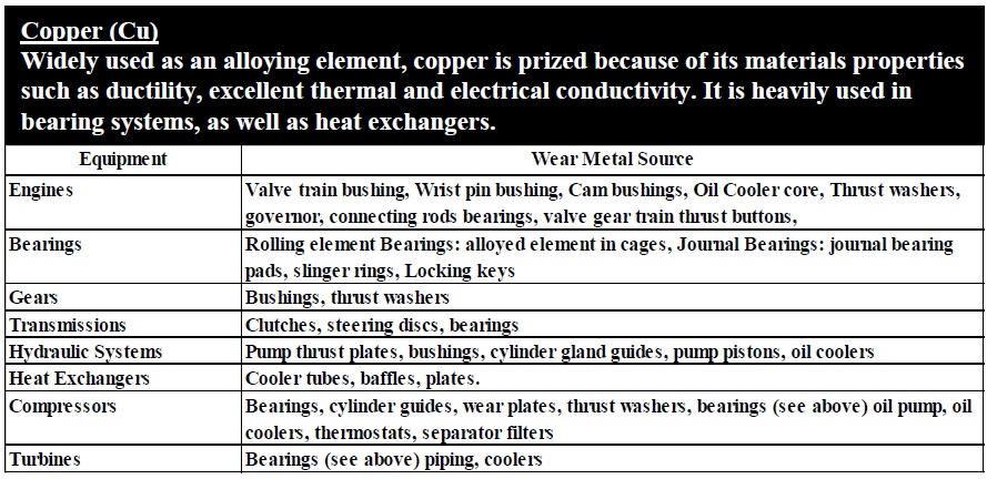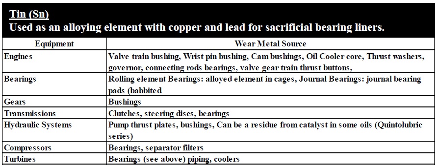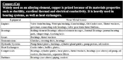 Dikutip dari : Handbook The Oil Analysis Handbook by “Michael Holloway” bahwa dibawah ini adalah bahan dari peralatan yang mana juga bisa digunakan untuk melihat sumber dari oli yang tercemar logam kontaminan.