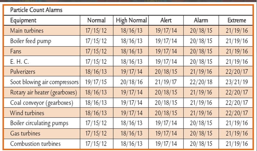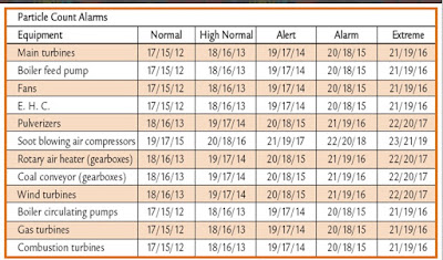Menurut standar ISO Codes diatas terdapat bermacam – macam standar yang dipakai untuk Oil Analysis tergantung dari pelumasan untuk apa oli itu. Standar umum yang dipakai di pembangkitan (PLTU) adalah memakai 20/18/15 mengacu ke kedua tabel diatas.