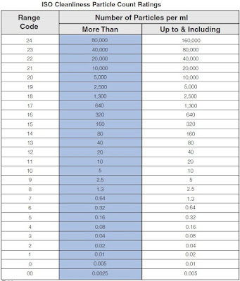 Penghitungan jumlah partikel kontaminan di oli ditunjukkan seperti tabel diatas. Mengacu pada ISO 4406 bahwa penyebutan ISO Code Range dipergunakan untuk memudahkan penamaan banyaknya kandungan partikel dan biasanya penulisannya dalam bentuk X/Y/Z sebagai contoh ISO Code Standar adalah :